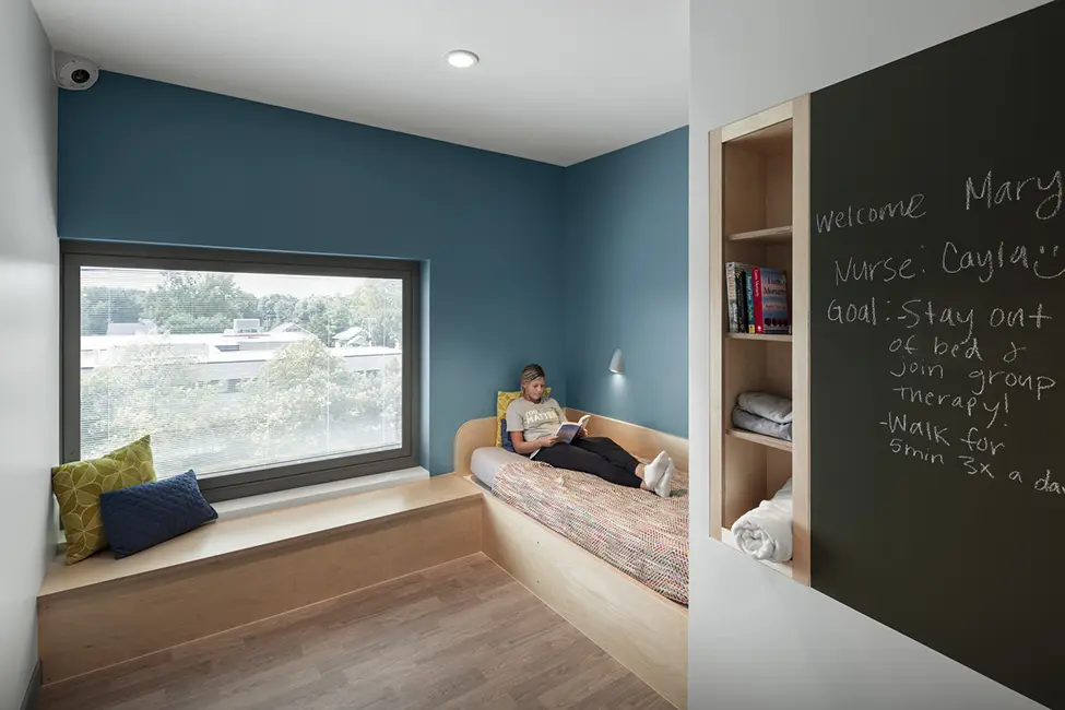 Patient comfort was also top of mind for the hospital. Soft, calm colors were used on the walls, complemented by bright white counters and soft woods in the flooring and cabinetry. Lots of natural light was incorporated, especially in patient rooms, and patients can also choose the light levels in their rooms to provide more autonomy. Benches in the hallways act like front porches outside of rooms, and each unit has artwork on the walls. Patients also can access quiet activity rooms for private use or group rooms for socialization and various therapies.