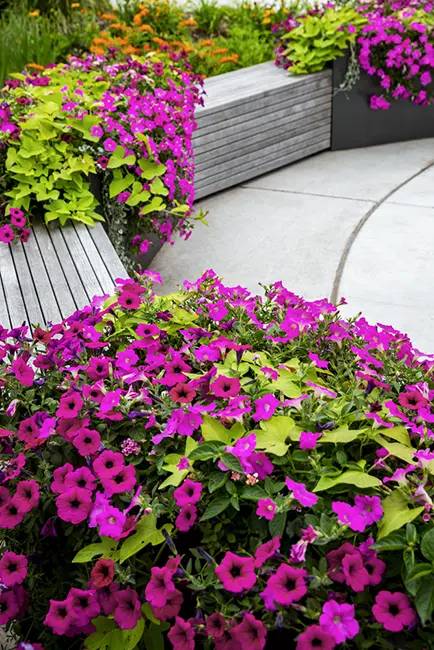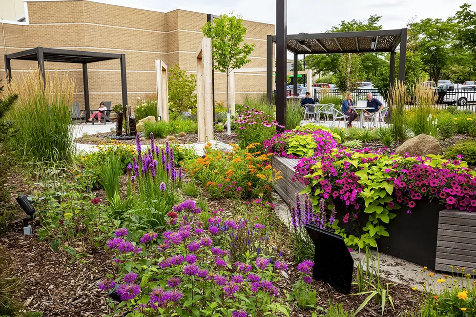 Mary Greeley’s new Healing Garden offers a welcoming and less stressful entrance experience for cancer patients, as well as adding visibility to the medical center from busy Duff Avenue. Not only patients but staff also enjoy spending time in the gardens, with a variety of seating options to get visitors immersed in nature. While the in-ground plants are perennials, the medical center partnered with the Master Gardeners in Ames to help maintain the planters with annuals to add vibrant colors