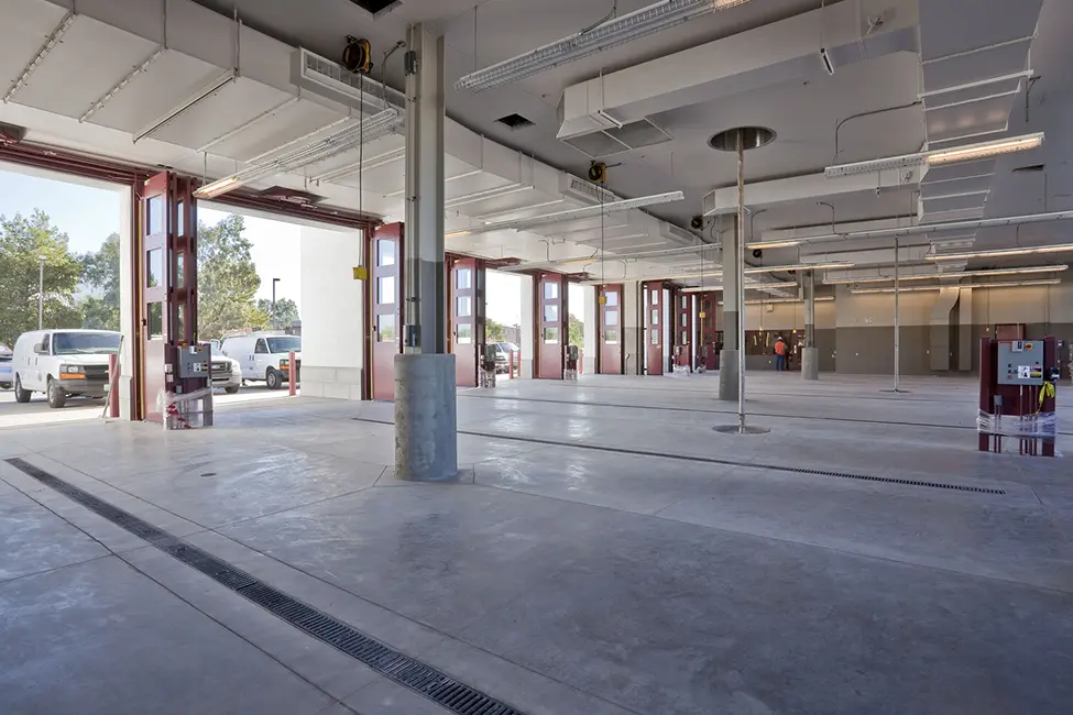 Fire Station One houses twelve firefighters and EMTs in individual dorm rooms and contains kitchen, dining and dayroom areas for their use. There is a fitness room and a study to encourage physical and mental development. There are eight drive-through apparatus bays in two different wings. Off of each apparatus wing are locker rooms for the firefighting apparel and equipment and cleanup rooms for decontamination after fire or medical calls. Radio monitoring and report writing are done in the watch room, which also has a transaction window and counter connecting it to the public lobby. There are separate access and response routes for the apparatus. Living quarters are located above the apparatus bays with fire pole access to the apparatus floor. The ground floor provides space for the watch room, Battalion Chief and EC Captain’s offices and their sleeping rooms. The longest bays are located in the center of the station providing the maximum turning radius for the longer apparatus. Bi-fold apparatus bay doors were used to decrease response times and to provide for a traditional fire station appearance. The hose tower is located between the fire station and the office wing. Hose washing is done directly outside on the apron south of the apparatus bays. The clean-up area and turnout storage are located on the west side of the bays. The clean-up room also provides hose storage (on rolling racks) the SCBA compressor, the building compressor and the extractor. Its location provides easy access from the bays, but separates the noisy functions away from the watch room and the sleeping rooms on the upper floor.