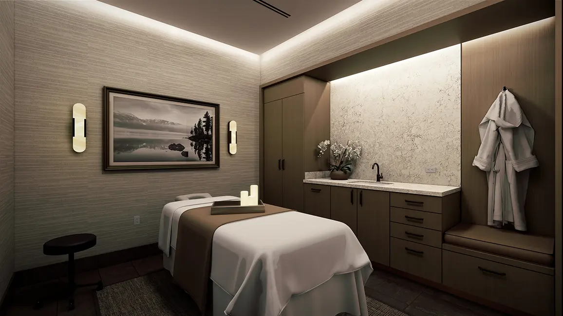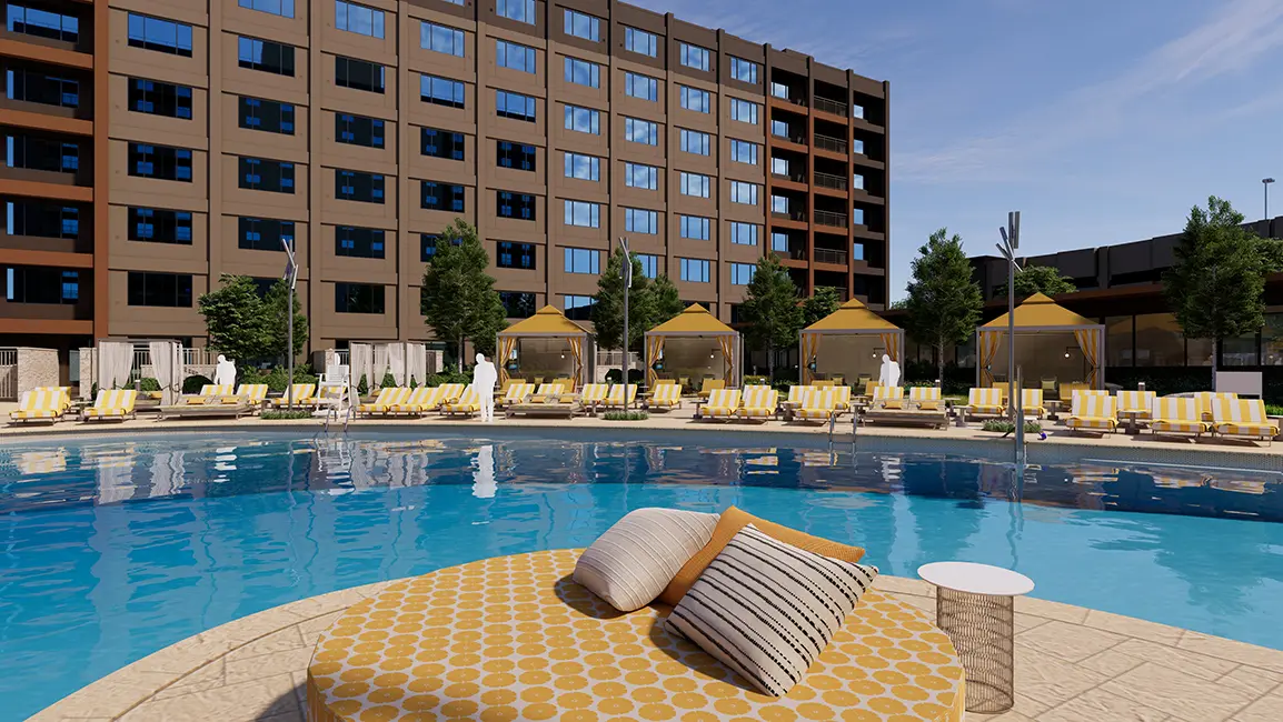 The outdoor pool area will be completely redeveloped with entirely new features including a pool bar structure with multiple seating areas, table games and full bar experience. New daybeds, private cabanas, and poolside loungers along with new landscaping are incorporated into the new resort pool. A hot tub cluster with fire pit groupings have been added to the pool area venue. The fully redesigned pool deck area will feature a fully heated bar area, a heated pool and pool deck capable of year-round comfort for the resort customer.