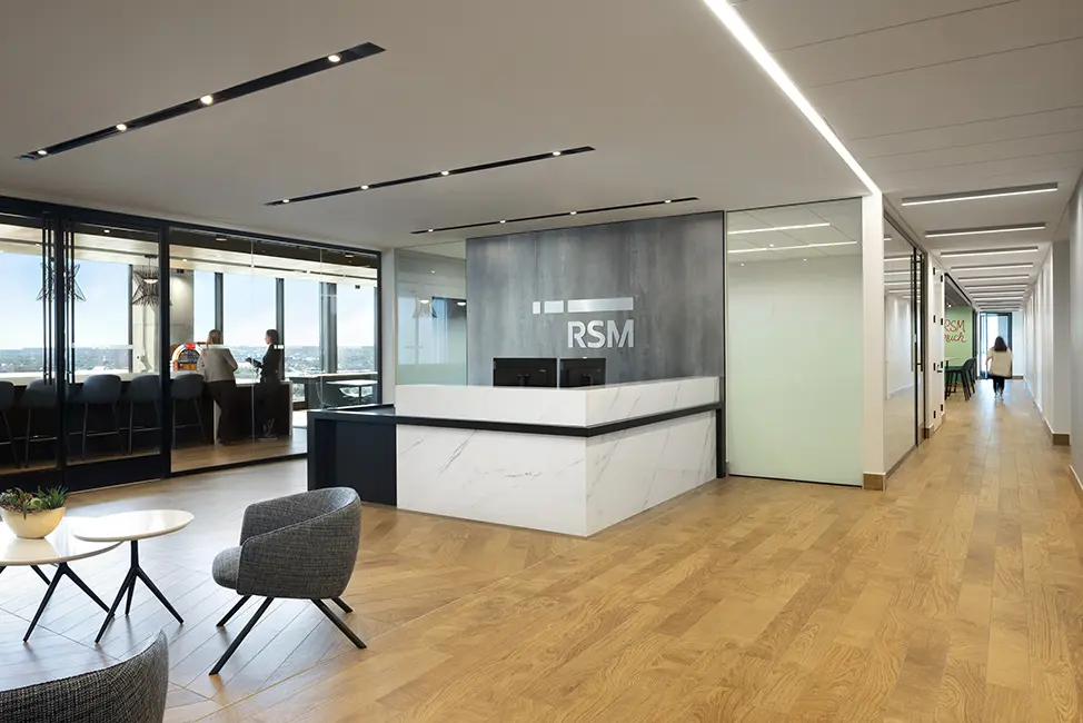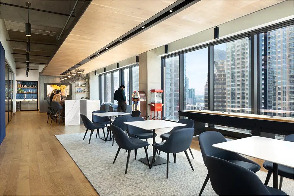 With some of its employees having to work off-campus because of space issues, accounting firm RSM needed to find a larger home for its Austin office. RSM chose the 17th floor of a brand-new office building downtown because of its views overlooking the Colorado River, its proximity to amenities for employees, and because it was raw space that they could design to their liking. The company wanted the new office to stay true to the local aesthetic and be a showcase for visiting clients.