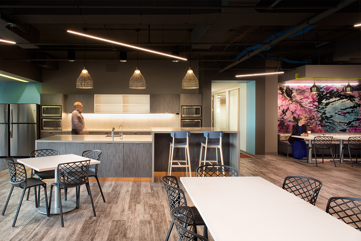As a nod to the organization’s history of serving those in the mobile-device industry, the reception area features a backlit resin wall, representing the glowing screen of a smartphone. Large couches and artwork printed onto aluminum panels offer a comfortable and unique waiting area.