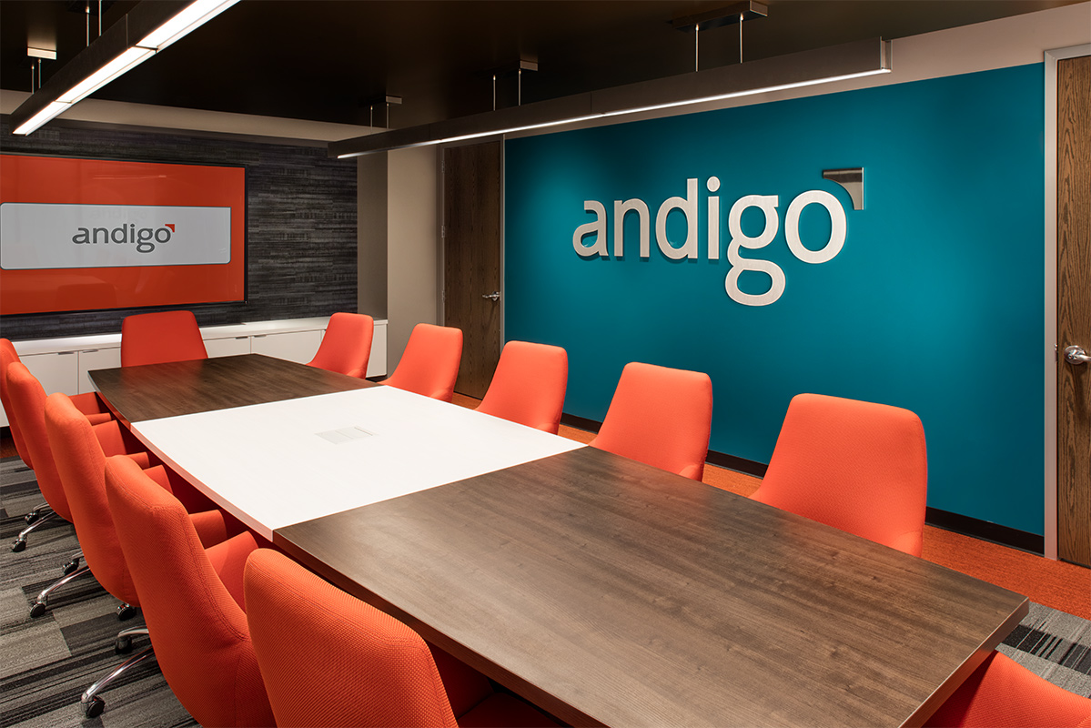 Working with 24,000 square feet in the Schaumburg Corporate Center near Chicago O’Hare International Airport, the new space allows all employees to be located on the same floor. Partnering closely with the Andigo Credit Union board of directors, Shive-Hattery led the corporate headquarters buildout and created new work-environment standards to reflect the organization’s new brand and identity.Instead of an interior that reflected the look and feel of a bank, the newly named Andigo Credit Union wanted a forward-thinking, high-tech space that wasn’t often seen in the financial industry. Orange and gray were chosen as the primary colors, with complementary colors used throughout the space as well.