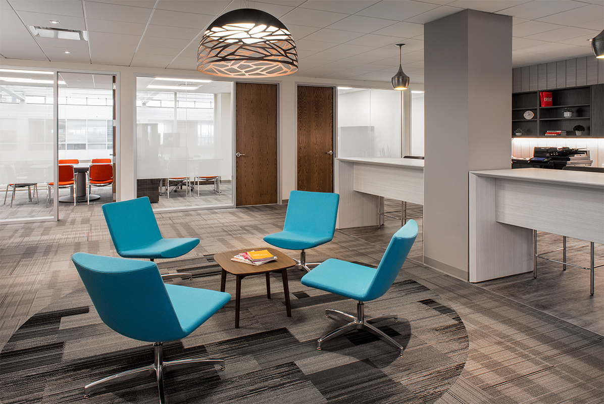 Universal 6-foot by 6-foot workstations are located throughout the space, with a mix of 10-foot by 15-foot offices included as well. This design allows Andigo Credit Union to be flexible with its workspace as it grows and changes. The executive office area is open, offering a visual connection to other staff members and removing the issues of separation the organization dealt with in its previous location. The center of the space features a collaboration area with a cozy, living-room feel where people can come together. Smaller collaboration areas – a mix of open and closed spaces – are also scattered throughout.