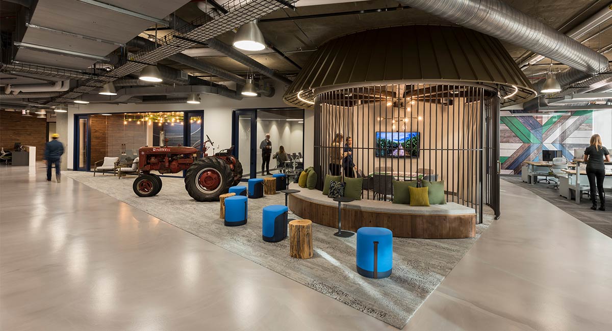 In the company’s breakroom, a divider wall features graphics that illustrate healthy cornstalk roots. Another prominent wall displays the proper cellular structure of a corn leaf, translated into abstract art to offer a nod to agriculture in a sleek, modern way.