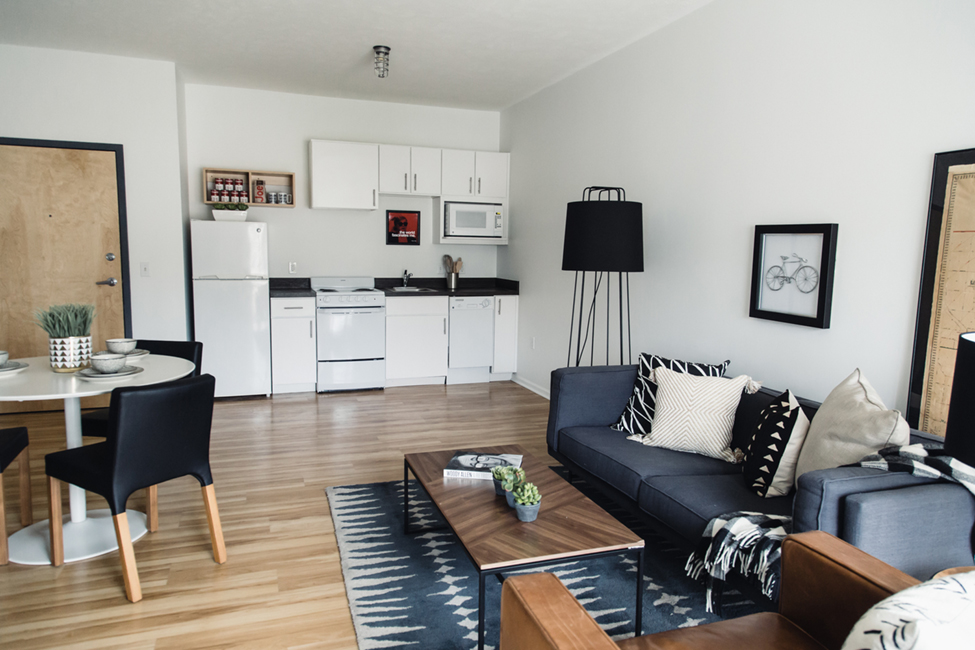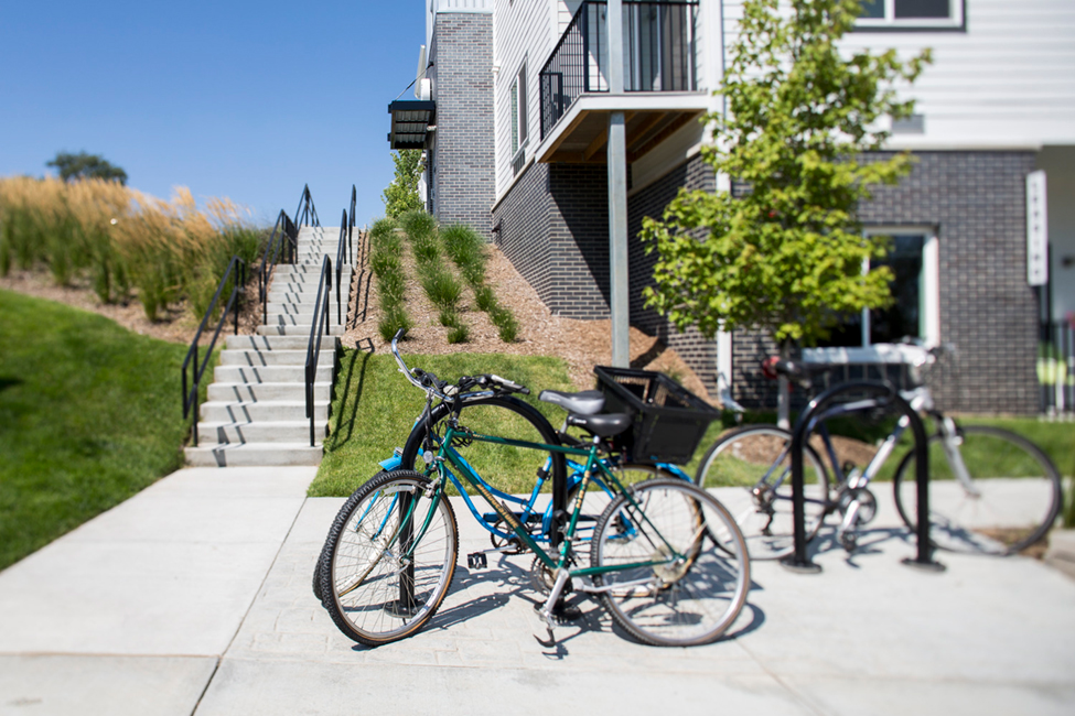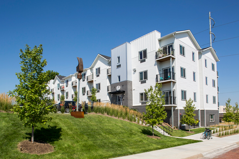 The unit types include mostly studio apartments, but also one and two-bedroom units. The small site was located on a significant slope which led to several walk-up units as well. A consistent aesthetic with The Towns exterior via scale and shape was an important design consideration. White siding and corrugated metal adorn the majority of the exterior while masonry around the base adds a visual anchor to the structure and highlights the building's entry points. The Towns consist of individual townhomes each with its own gable roof, so Shive-Hattery resolved to break up the side of the apartment building visually so that it appeared to be separate towers with separate gable roofs.