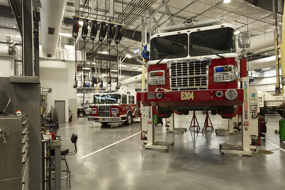 The new facility houses multiple Public Works departments and provides site exterior space for parking and storage of city vehicles and equipment. The fleet maintenance department, which repairs all city vehicles including large vehicles such as sanitation and fire department trucks, is located in the building. Vehicles enter the maintenance bays inside the building which includes a parts warehouse, providing conditioned space for the maintenance staff. The rest of the building houses administrative offices for Streets, Signs, and Solid Waste departments, which previously were located at separate sites. These departments share conference spaces and break areas that are centrally situated. The shared spaces provide both better amenities for each department and savings for the city. WSM worked closely with the city staff to understand the goals and priorities of these different departments in order to provide the best value for the city’s limited budget.