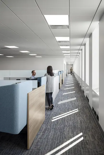 Shive-Hattery worked with DAS, HHS, and DCI Group to evaluate the user’s program needs and existing infrastructure to reimagine the space in a fiscally responsible manner. The project scope spanned seven floors and 120,000 sf of office space. The new workplace model features a mixture of workstation types and sizes, private offices, individual focus rooms, and various conference room spaces. The space planning efforts intentionally lowered the workstation panel heights and opened up the views at the exterior of the building to allow natural daylight to all employees. The renovated space provides a safe and secure workplace for all employees, yet connect them in new ways.