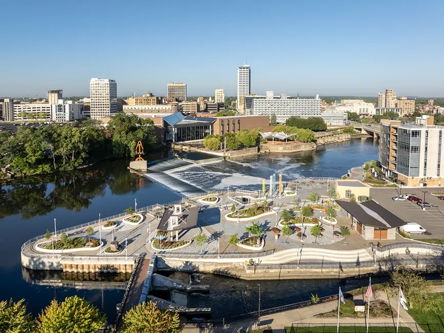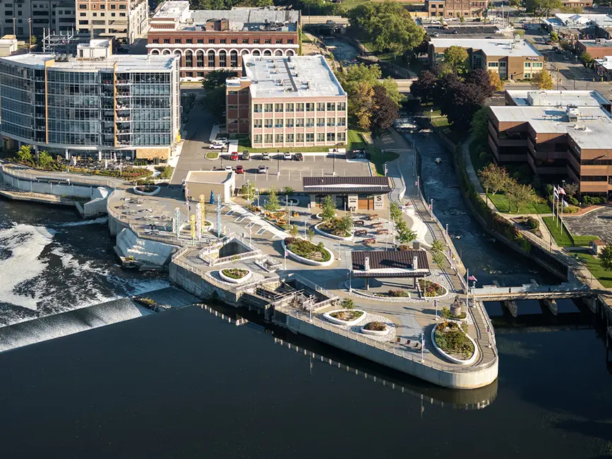 The City of South Bend wanted to revitalize Seitz Park, a beloved public space along the St. Joseph River, while accommodating the University of Notre Dame’s new hydroelectric plant. The challenge was integrating infrastructure improvements with a park renovation that honored the site’s history and enhanced its role as a community destination. The project needed to balance sustainability goals with amenities that would attract visitors and support events. Collaboration between the City and Notre Dame was key to ensuring the park remained a vibrant part of South Bend’s riverfront.