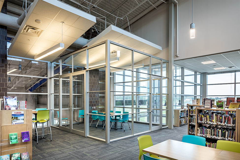 The main office was relocated to the addition to provide visibility to the main campus core and create a secure entrance. A new bus drop off was added to improve the safety of students. Adjacent to a large commons space and entrance area a large canopy provides shelter for students as they gather before school and between extra-curricular activities.