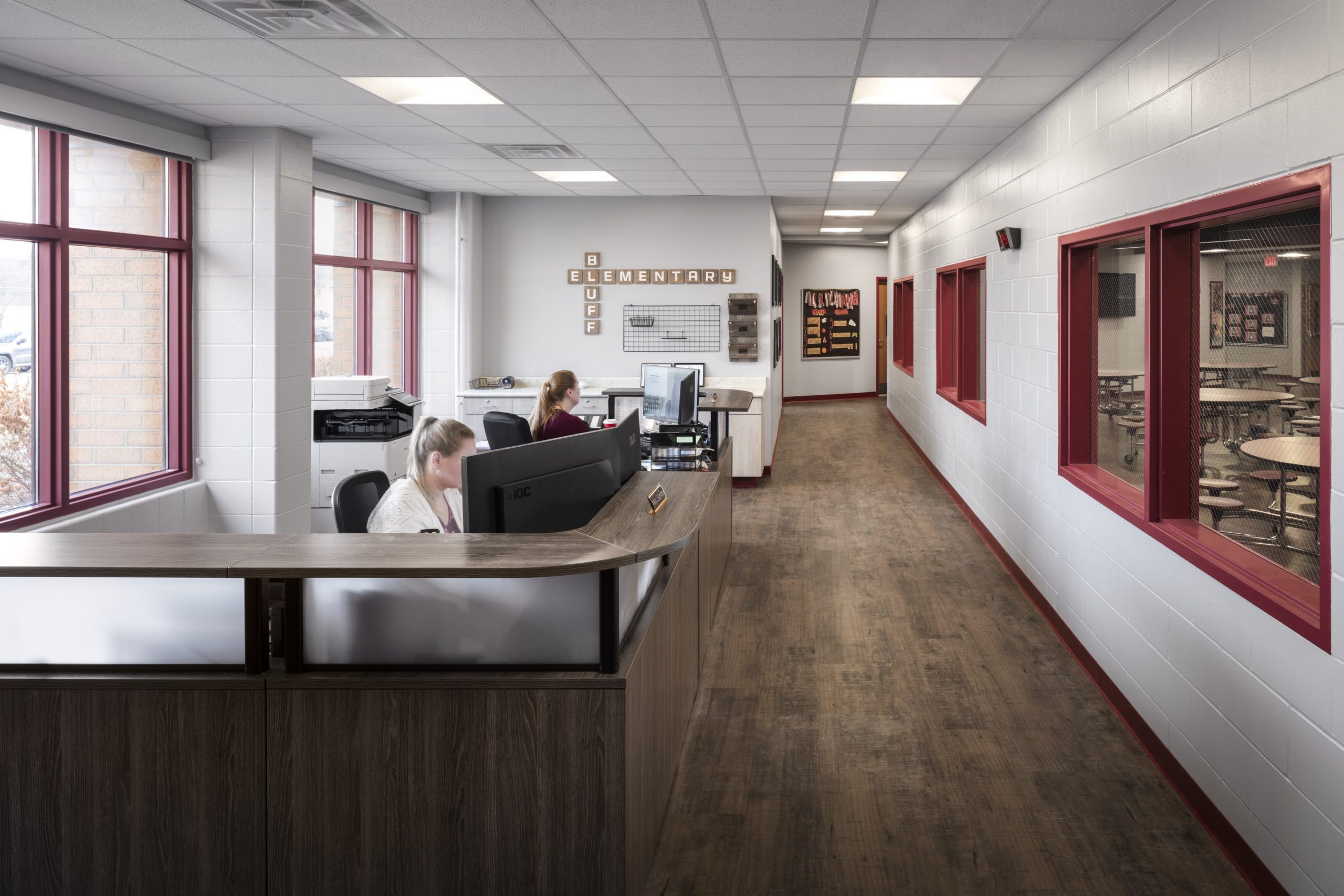 Bluff Elementary in Clinton, Iowa, was built in the 1990s with an open concept, with visitors gaining access to the school through a large atrium and the main office located down a corridor. The Clinton Community School District wanted to bring Bluff more in line with the security measures used at its other buildings, as well as give the entry and commons area an updated look. Since creating a route directly to the office from the entrance would have blocked corridor access to places like the library, it was decided that making the office physically adjacent to the entrance would increase security without disrupting the flow of students.