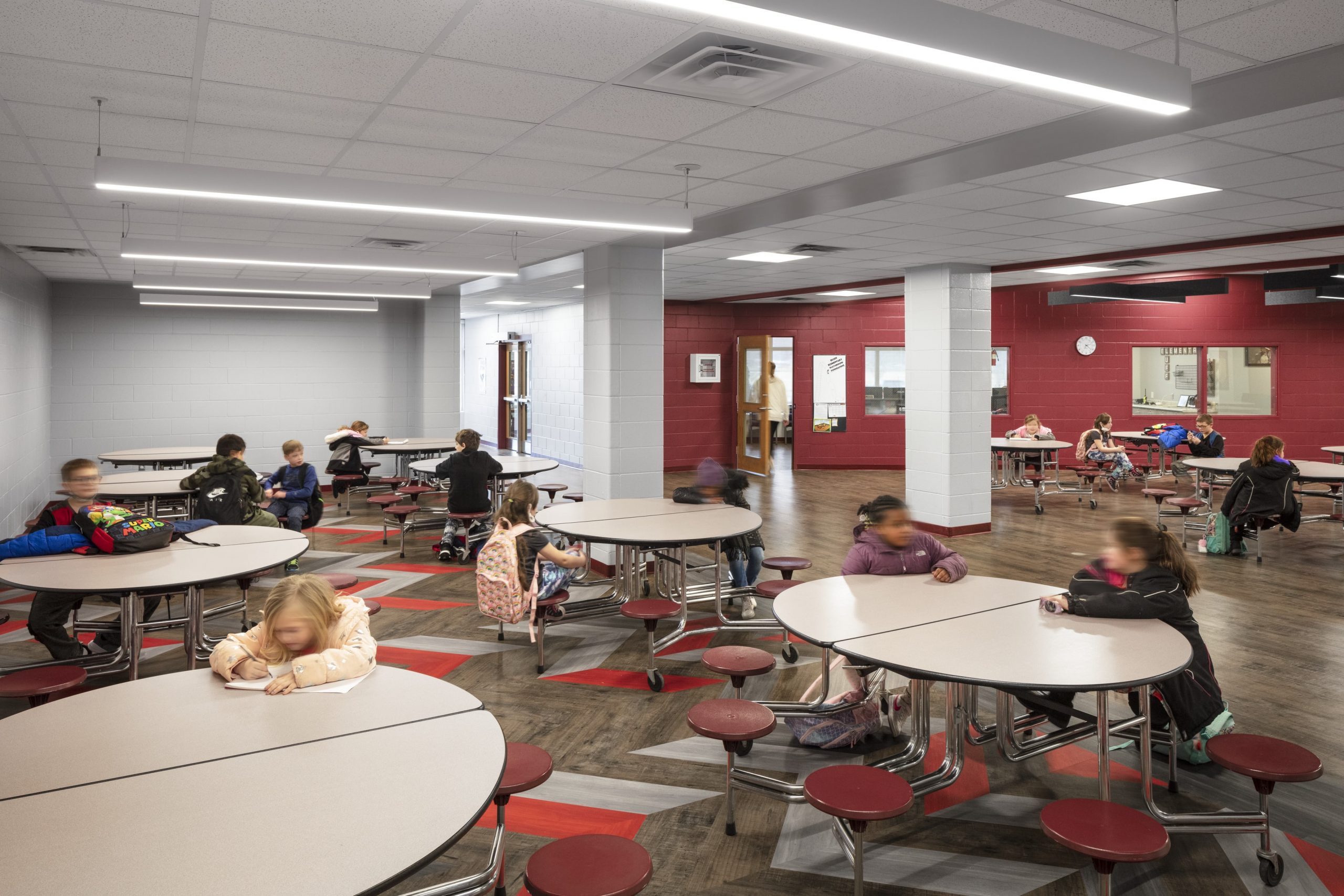 Beige block walls and peeling up flooring in the entrance and cafeteria areas were replaced with more vibrant finishes. The school’s colors of red, black and white were used in both the new LVT flooring and on the walls to add color and visual interest.