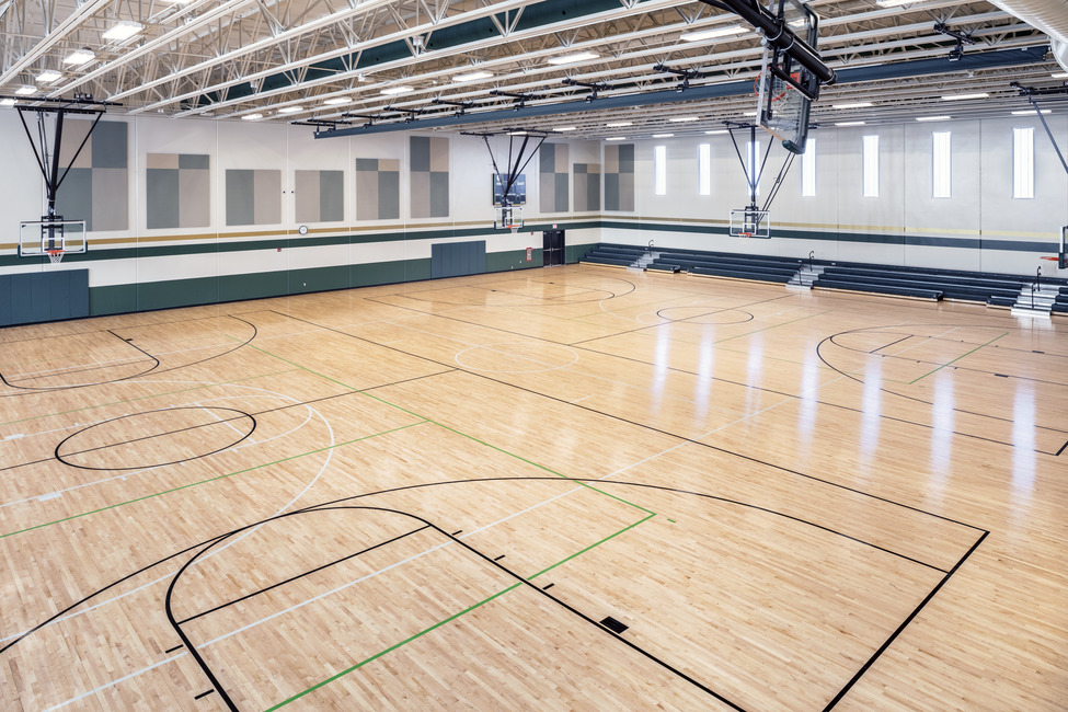 The gym also includes a performance PE space with a wood dance floor, high ceilings, a ballet bar, and mirrored walls that can be used for cheerleading and dance practice. The room’s versatility allows teachers to expand the physical education curriculum as well.
