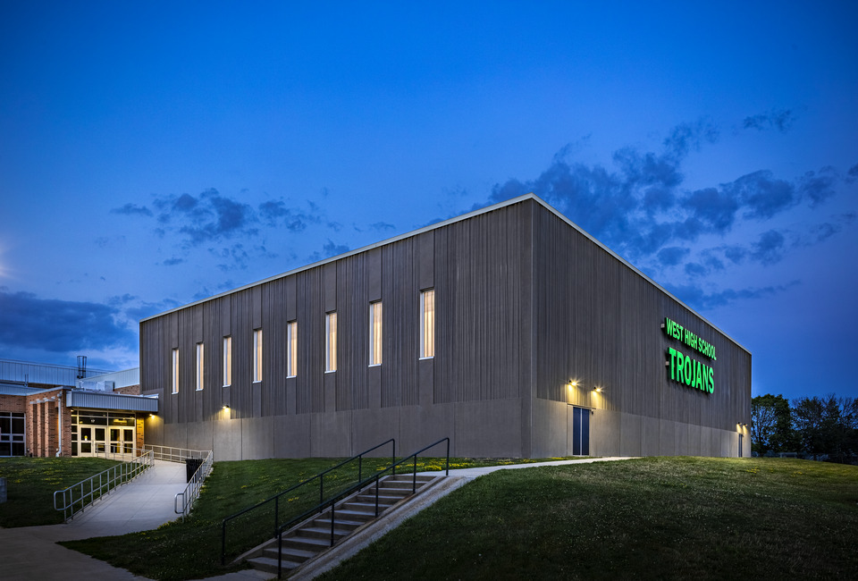 To give West High School a gym large enough to accommodate practice on a competition-sized court, Shive-Hattery designed a new space with two full-sized, side-by-side courts, as well as a college-level competition court. Constructed out of precast concrete, it serves as a hardened space for severe weather and is designed to withstand an EF3 tornado.