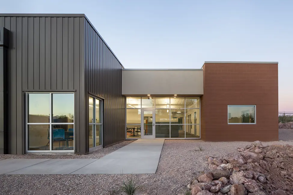The Administration Building is located in southwest Tucson within the Drexel Heights neighborhood. Funded by a voter-approved bond issue, this 10,362 SF facility was situated to be a more central part of the Fire District. The building replaces an older community center, with a new masonry and metal panel structure that houses offices, a training classroom and a new meeting room for the Board of Directors. The training room is also used for community outreach.
