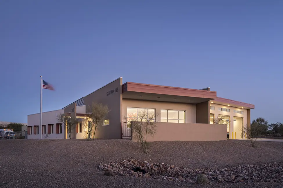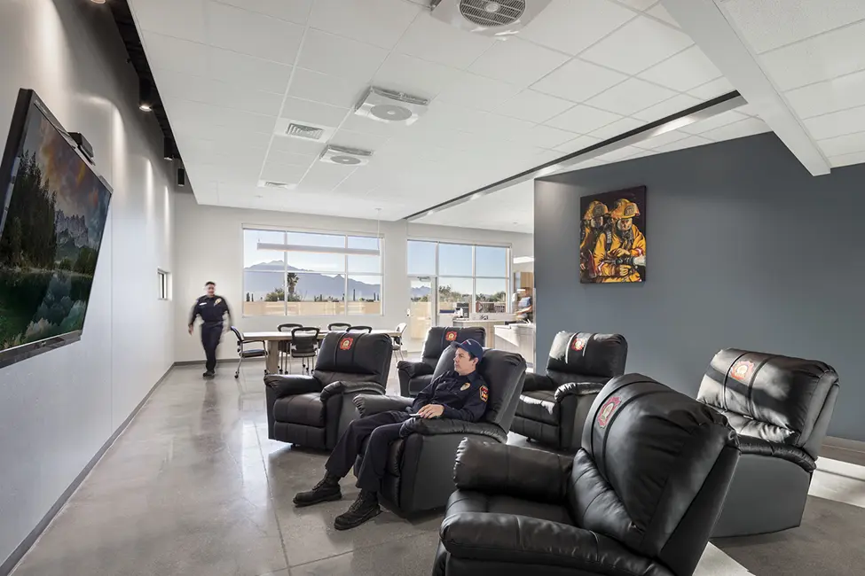 The new Station 152 is equipped with 3-drive-thru bays with a decontamination alcove, seven bunk rooms, three non-gendered shower rooms, cooking and eating spaces, dayroom, offices, and a turnout room. Special features of this fire station: living areas (dayroom and kitchen) are angled to take in the views of the Santa Rita Mountain range. All mechanical equipment is roof mounted and hidden behind a mechanical screen wall. The station design concept was taken from the residential home design across the street featuring large vertical masonry walls with a single pitched sloped roof. Shive-Hattery was very cognizant of the local architectural style of the community of Green Valley.