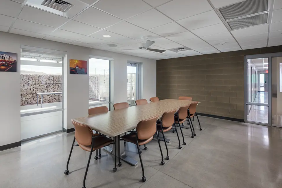 A primary focus of the project was the crews’ health and wellness. The design provides separation of ‘hot’ and ‘cold’ zones through space planning and environmental systems for healthy working and living environments. Important to the crews’ mental health are restful, regenerative spaces between calls, such as the exterior patio with southwest views of the mountains.