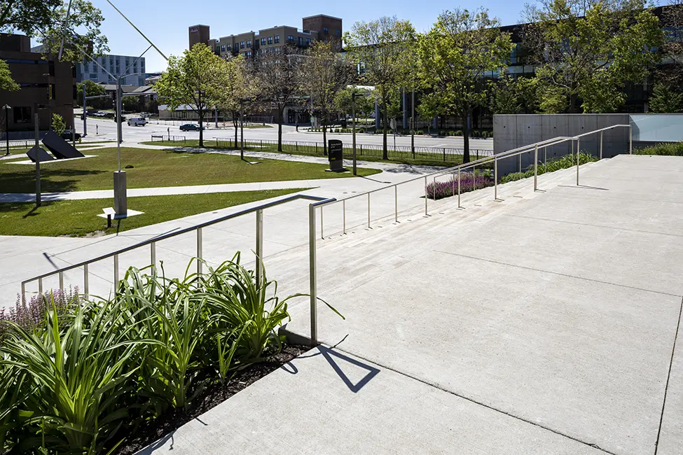 Shive-Hattery Landscape Architecture studio worked with BNIM Architects to design a dramatic landscape that highlights the new building while integrating with the fabric of the campus. The museum sits directly adjacent to Gibson Square, a historic campus “park”. The design team carefully studied how to integrate the new, modern building with the traditional park and how to maintain important pedestrian routes through the site.