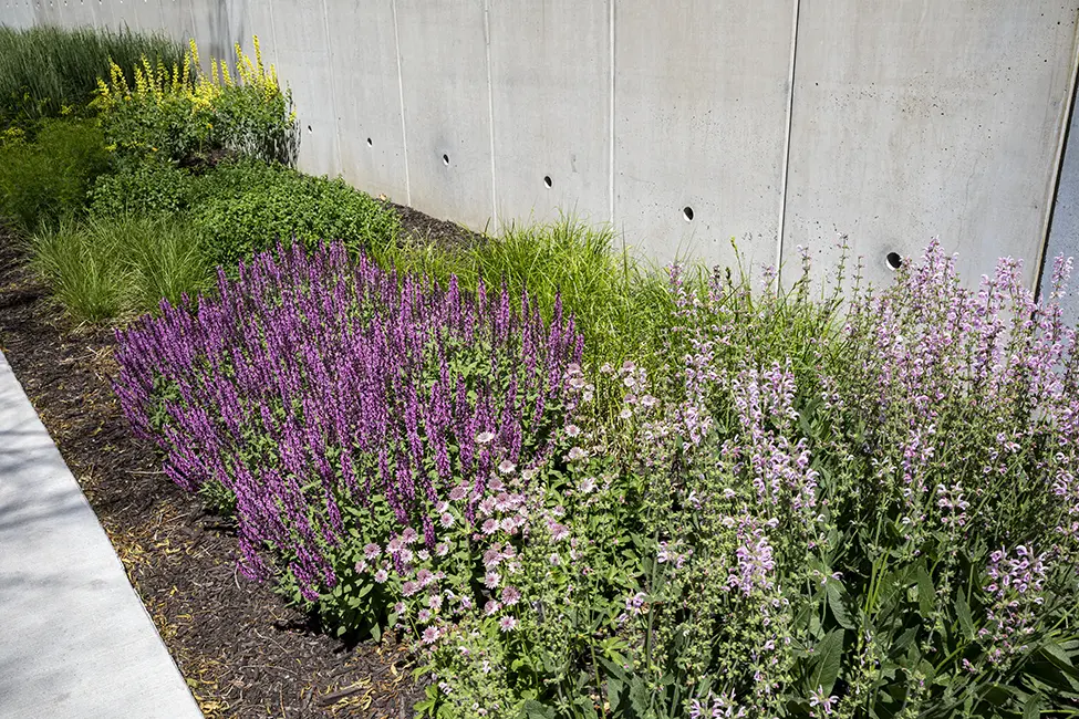 The main planting feature is a dynamic perennial bed along the slope in front of the building. The design of this bed is inspired by impressionist paintings with a tapestry of colors and texture that change throughout the year.