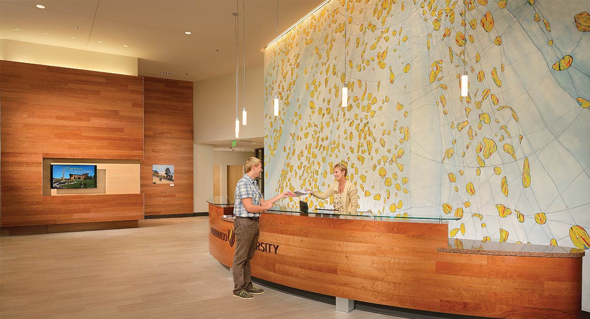 The 14,800-square-foot building is located on a prominent meadow at the main campus entrance and is sited to afford panoramic views of the University. The sloping roof form frames a view of the iconic Chapel of the Resurrection, which represents Valparaiso University's foundation as a faith based institution. The lobby is a transparent welcoming beacon of activity day and night. The story of the Valparaiso University is woven through the building to reinforce the University mission and values to all who visit. The Welcome Center is home to Admissions, Enrollment and Educational Recruiting as well as meeting and presentation spaces.