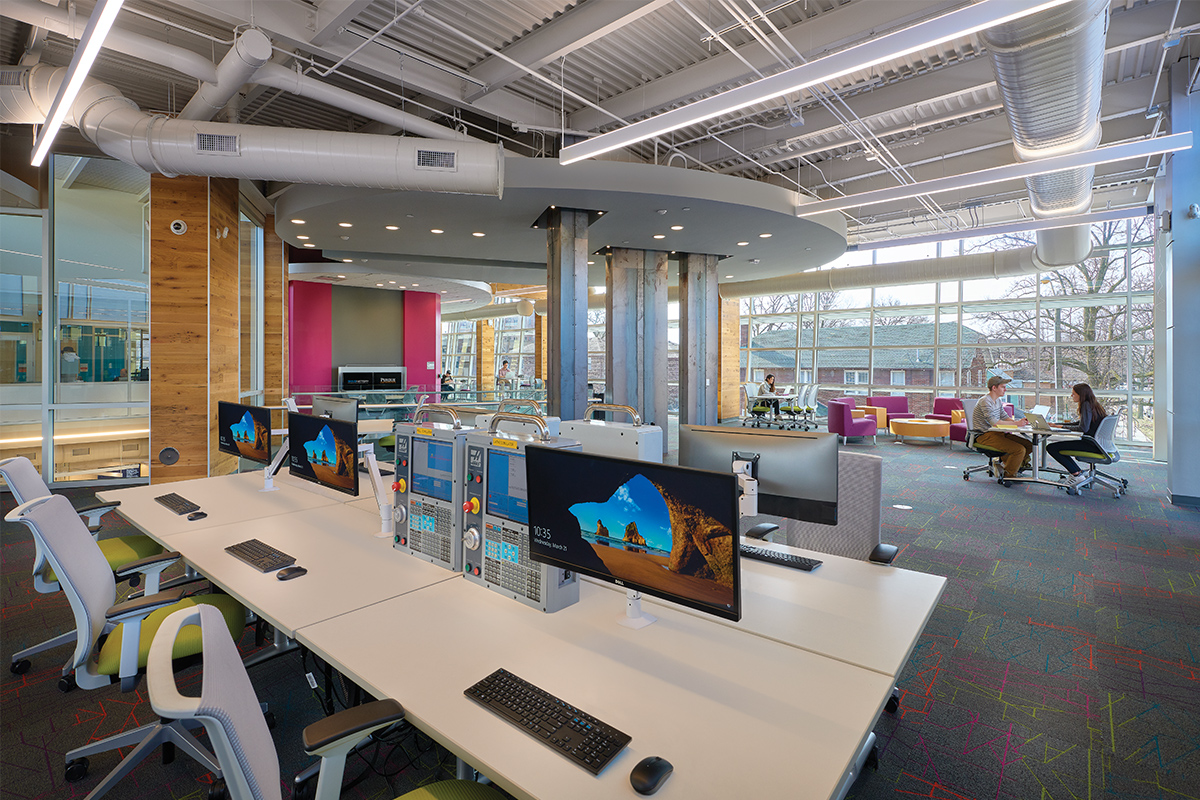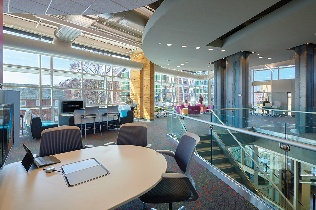 Student access to faculty is enhanced with office and administrative space for College of Engineering and College of Technology integrated into the building design. The intentionally transparent environment encourages views of project-building from circulation spaces and teaming areas, as well as visual connection to and from the “Student Success Corridor” (the nickname for street on which the building is located) creating a “see-and-be-seen” environment.