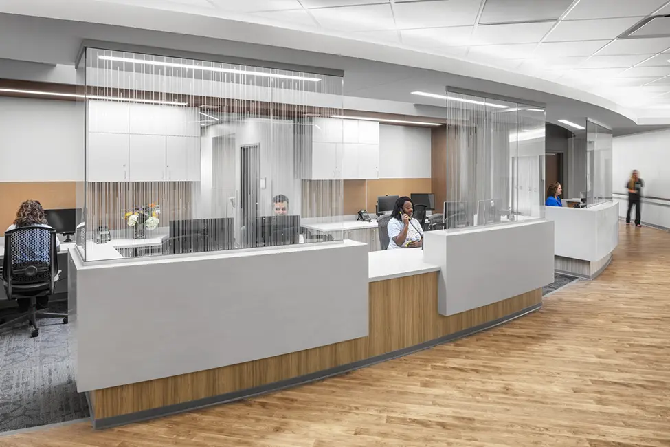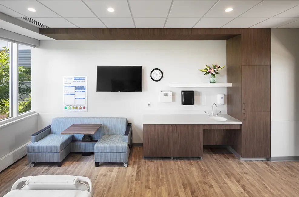 The design of the Family Birthing Unit has a strong focus on patient experience. The unit has abundant glazing, nature inspired graphics throughout and a thoughtfully planned headwall to conceal medical outlet and equipment when not in use. The labor/delivery/recovery/postpartum rooms also incorporate tubs near the patient beds to allow patients to labor in water, which can reduce the need for anesthetics. When the tub is not in use, a barn door separates the tub from the patient room.