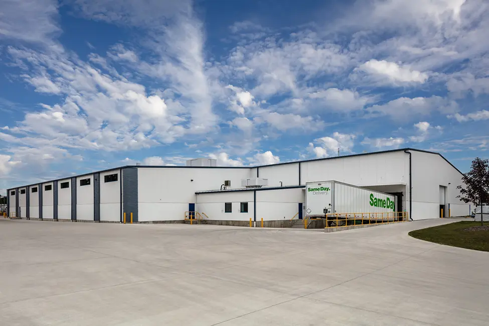 The entire facility was evaluated for operational efficiency, which then informed the design. One problem the design team sought to solve was all the truck, car, and pedestrian traffic to the building was combined – semis would turn around by driving around the lot full of parked cars. By shifting the location of the addition into some of the parking lot on the north side of the building, a new lot was able to be built on the south side. This separation of truck and car