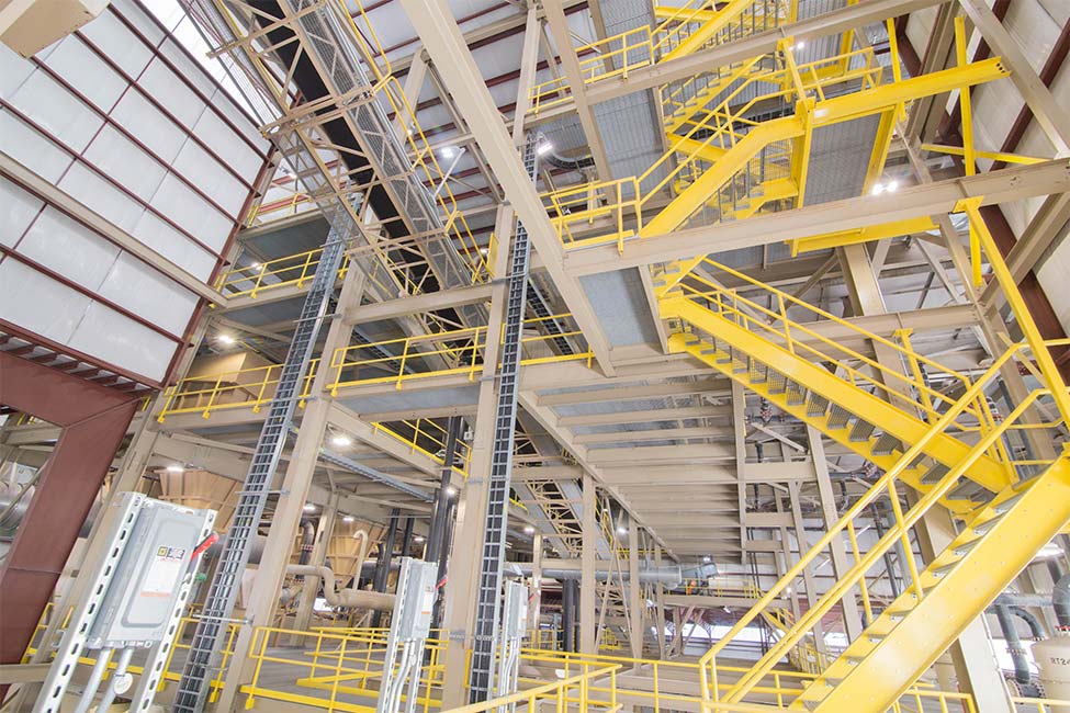 Our design included equipment support and access platforms for dryers, conveyors, silos, cyclones, piping, vacuum pumps, accessories, hoist beams, MCC, hydrosizer equipment and accessories, and clarifier equipment. Shive-Hattery provided foundation design for a PEMB, as well as design for a storm shelter located within the warehouse footprint. Machine load allowance was used in the design of the primary steel frame and lateral support to allow for future bridge cranes and hoists.
