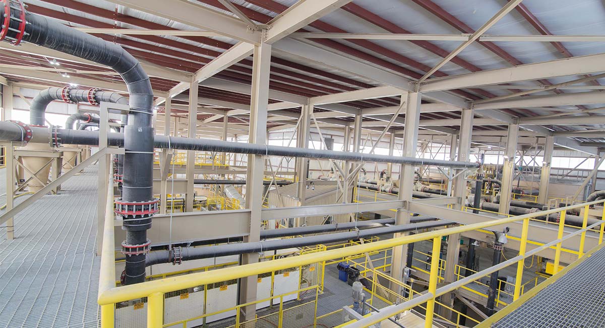 The building foundations needed to account for dust collectors, fans, stacks, a 3,000 ton silo, and site exterior conveyors. Primary steel structures includes support for load-out equipment and surge bin for three rail load-out structures. We provided framing for the building structures including the filterbelt building, slurry silo link, hydrosizer building, and damp material/dryer building.