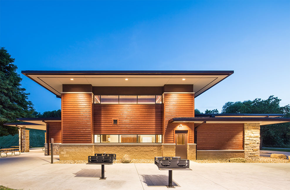 The Linn County Conservation Board wished to make upgrades to a 40-year-old lodge in Squaw Creek Park in Marion, Iowa, that is popular for weddings, graduation parties, reunions and other community events. Red Cedar Lodge, originally constructed in 1976, did not meet Americans with Disabilities Act (ADA) requirements, had no air conditioning, and the fireplace was in the center of the room, dividing the space. Linn County Conservation wanted to make improvements that would not only increase the functionality of the space but also make it more appealing to its users.