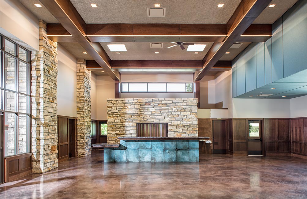 New spaces added to the lodge include a prep/catering kitchen, changing rooms for bridal parties, an outdoor back patio, and a room for table and chair storage. Wooden beams with accent lighting built into them add functionality and beauty to the main room. ADA parking stalls also were added near the building.