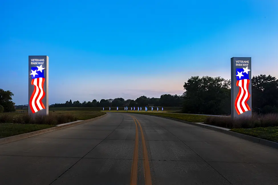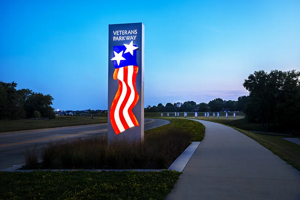 The City of West Des Moines, Iowa honored veterans with its Folded Flags art installation. Unveiled on Flag Day 2019, the 15-foot illuminating folded flags marks the first phase of an 11-mile roadway enhancement project beginning at Brown’s Woods Drive and Veterans Parkway. With Folded Flags, reflection is the main theme and serves as a reminder of our veterans’ service and sacrifice.