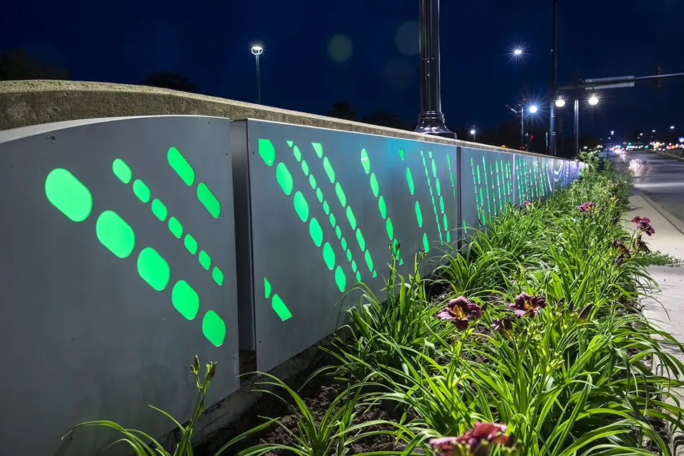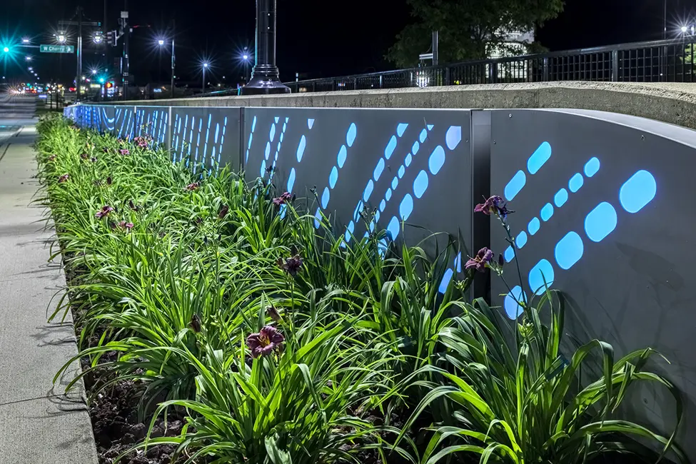Shive-Hattery prepared conceptual and functional plans for discussion with city staff, city council, utility companies, adjacent property owners, and stakeholders. To communicate the project to the public, Shive-Hattery prepared a video the City used on their website and media outlets to show the completed project. A five-lane roadway section was designed including new trails, sidewalks, LED street and pedestrian lights with decorative banners, artistic LED lighted bridge panels, and new landscaping. Stormwater quality improvement biocells were also utilized to provide clean water effluent.