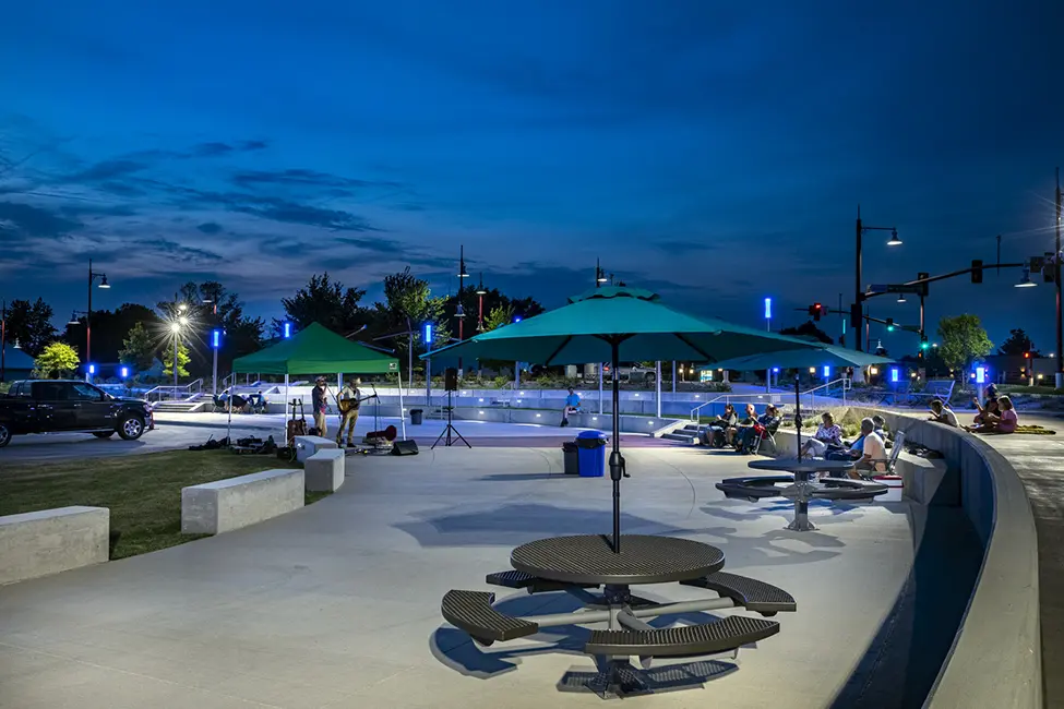 A multi-disciplinary team worked with Hiawatha City staff to find a design that would be beautiful and functional while staying within the City’s budget. The main level is a paved area connected to City Hall’s parking lot. It has colored pavement for aesthetics and is also thick enough for vehicles like food trucks to drive on. Three tiers of seat walls then arc around the main level. Each tier has a mix of seating options, such as benches and picnic tables with large maroon shade sails. Grassy areas between the tiers can hold blankets and lawn chairs to allow for more seating.