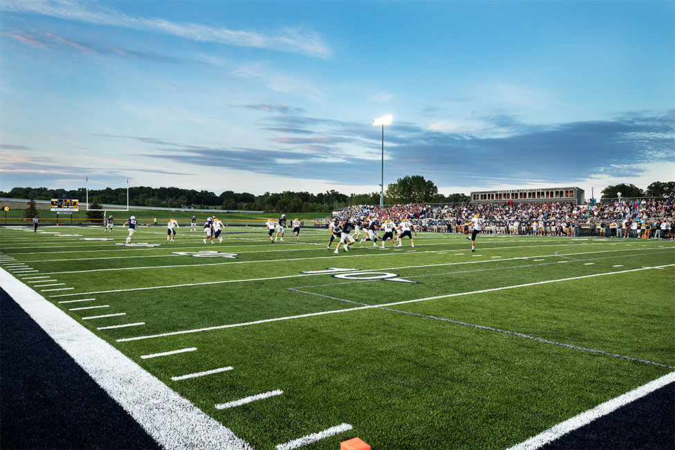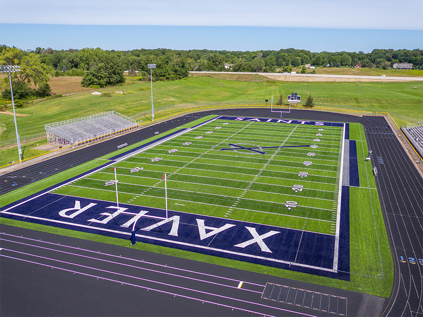 Xavier High School in Cedar Rapids is a football powerhouse, collecting three state championships since the school’s opening 20 years ago.  Prior to the recent renovation the school’s football field did not provide a higher performing facility to meet their needs. With a high-water table and large storm line that ran through the center, the natural grass field had constant drainage issues. Attempts to mitigate the wet soils with a tall field design created the highest crown in the state making it less useful for other sports like soccer. There was a lack of necessary space to include the long jump and high jump areas by the track, so athletes and spectators of those track events had to journey to another area of the school property.