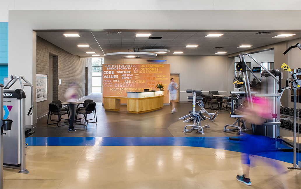 The former Genesis rehabilitation space was connected to the YMCA fitness area, allowing all cardio equipment to be located in the fitness area. All free-weights and strength training equipment could then be moved to what had been the rehabilitation space. Other Genesis spaces were renovated to accommodate a versatile exercise room and also private meeting rooms.
