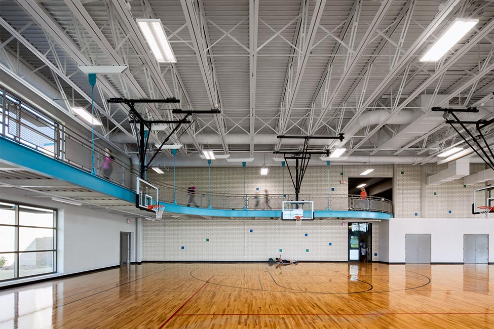 The new addition was built on the south side of the existing building. This portion includes two full-size basketball courts complete with a divider curtain and retractable cross-court goals. Natural light and views are provided through 2-story glass curtain walls that also include shading devices to prevent unwanted glare; this openness benefits players and runners alike.