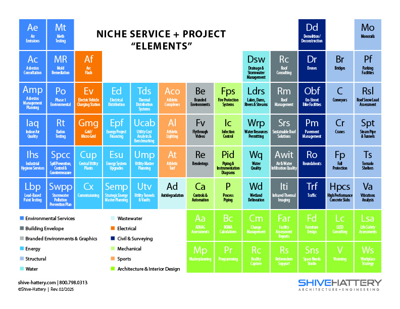 Use this periodic table as a convenient resource for no-surprises planning. Work with your AEC partner to identify which niche services are available and which could help save on cost, reduce downtime, and increase production for your facility.