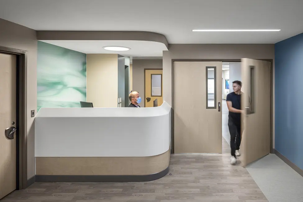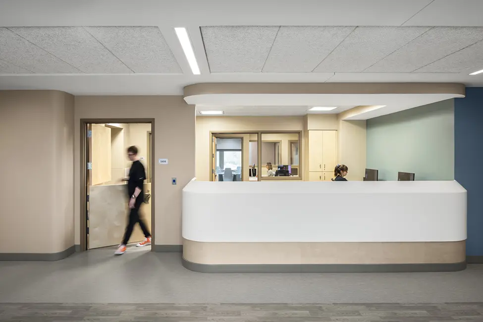 The Behavioral Health Unit (BHU) at Mary Greeley Medical Center in Ames was in need of modern patient safety features and more beds, as the unit often operated at capacity and had to turn patients away. The entire fourth floor of the South Tower was completely gutted and built out into the new BHU, allowing the hospital to continue treating patients during construction.