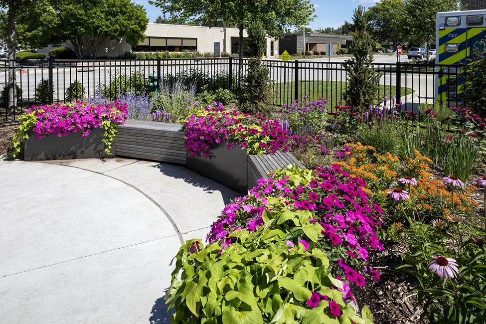 Mary Greeley’s new Healing Garden offers a welcoming and less stressful entrance experience for cancer patients, as well as adding visibility to the medical center from busy Duff Avenue. Not only patients but staff also enjoy spending time in the gardens, with a variety of seating options to get visitors immersed in nature. While the in-ground plants are perennials, the medical center partnered with the Master Gardeners in Ames to help maintain the planters with annuals to add vibrant colors