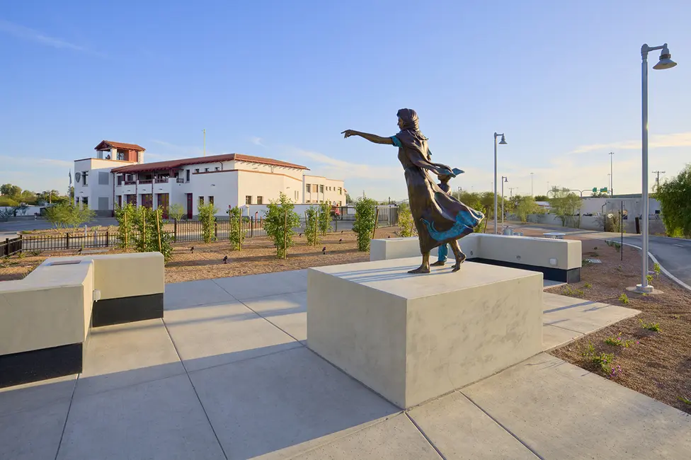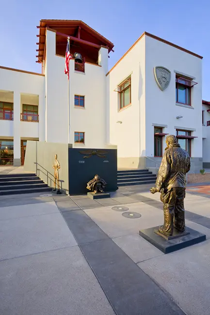 The site is located in Barrio Viejo, an historic neighborhood in Downtown Tucson. The building and site are designed to be “a good neighbor” to the Barrio by respecting the community’s culture and traditions. For example, the south portion of the site is given back to the Barrio as a formal Placita, designed in the spirit of a traditional Mexican plaza. Space was also provided for a memorial to the homes lost during the 1960’s urban renewal. In white stucco on masonry, the 32’ tall building encompasses 70,000 square feet of program, but is compatible in scale with the nearby adobe homes. In the spirit of a traditional fire station, a bell tower rises to 45’, and provides an observation patio from which the historic 5 Mile Bell from 1881 is housed. The Firefighter Memorial Plaza and bell tower lead into the main lobby and firefighter museum. Restored apparatus, firefighting equipment, and memorabilia displays also created by WSM are in the museum and throughout the building.