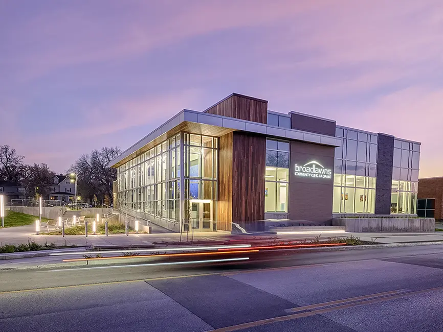 The neighborhood surrounding and including Drake University in Des Moines, Iowa, has historically been a medically underserved area of Polk County. To address this issue, Broadlawns Medical Center partnered with the university to open a clinic that provides physical and mental health services to Drake staff and students, as well as people living in the neighborhood. Located on busy University Avenue, across the street from the Drake University campus, and at one of the busiest bus stops in town, Broadlawns and Drake envisioned the clinic as a welcoming space for all modes of transportation.