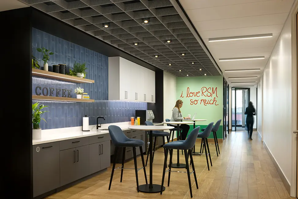 Neutral colors were used, with RSM brand colors like navy blue as accents. To highlight their city’s aesthetic, wood-look tile floors are in all of the main areas and accent walls have hot-rolled steel panels. Multiple custom murals by a local artist depict key areas of Austin. A large wood-look ceiling element was added in the social hub, requiring coordination with electrical, mechanical and structural engineers to camouflage the mechanical system and support structures.