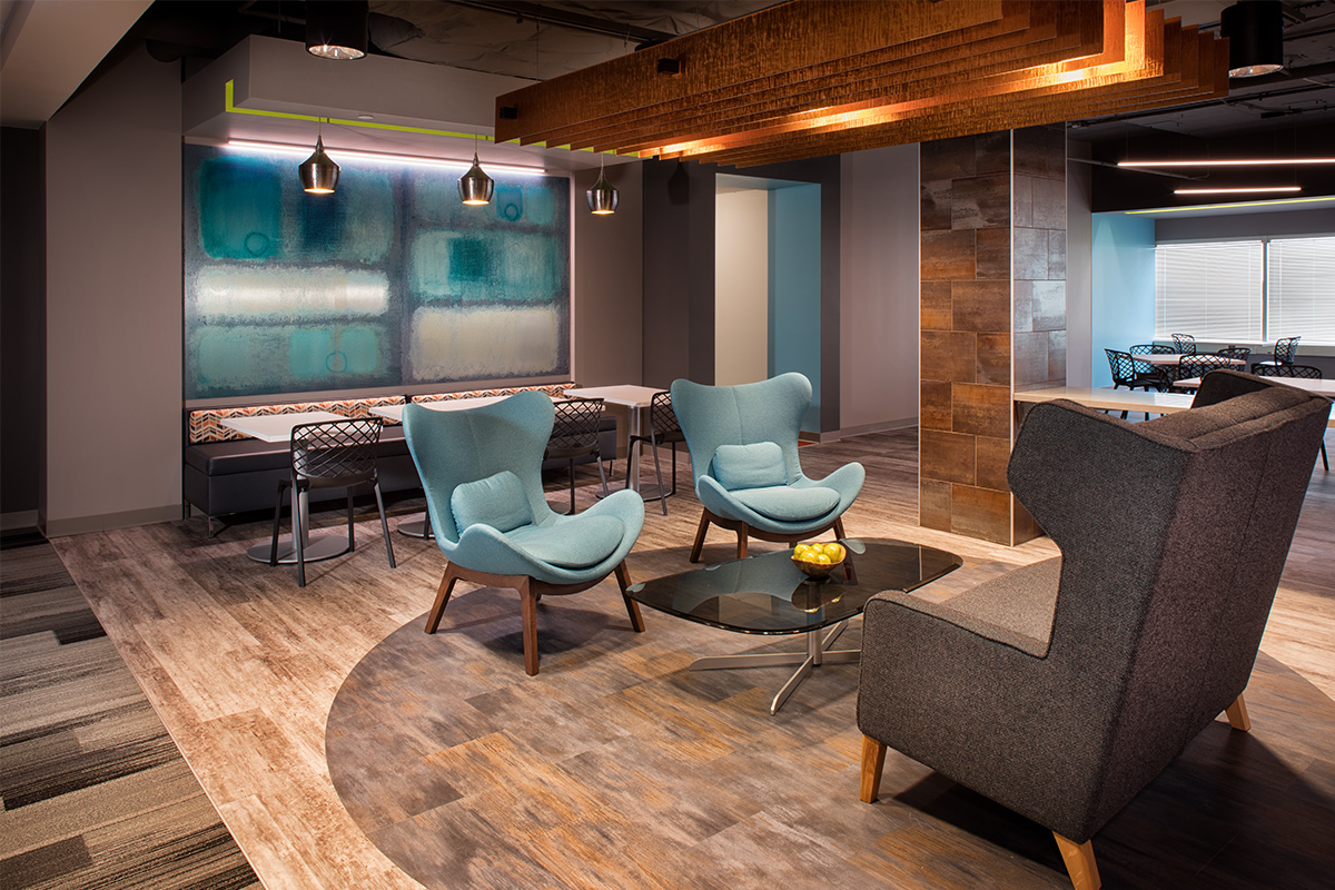 As a nod to the organization’s history of serving those in the mobile-device industry, the reception area features a backlit resin wall, representing the glowing screen of a smartphone. Large couches and artwork printed onto aluminum panels offer a comfortable and unique waiting area.