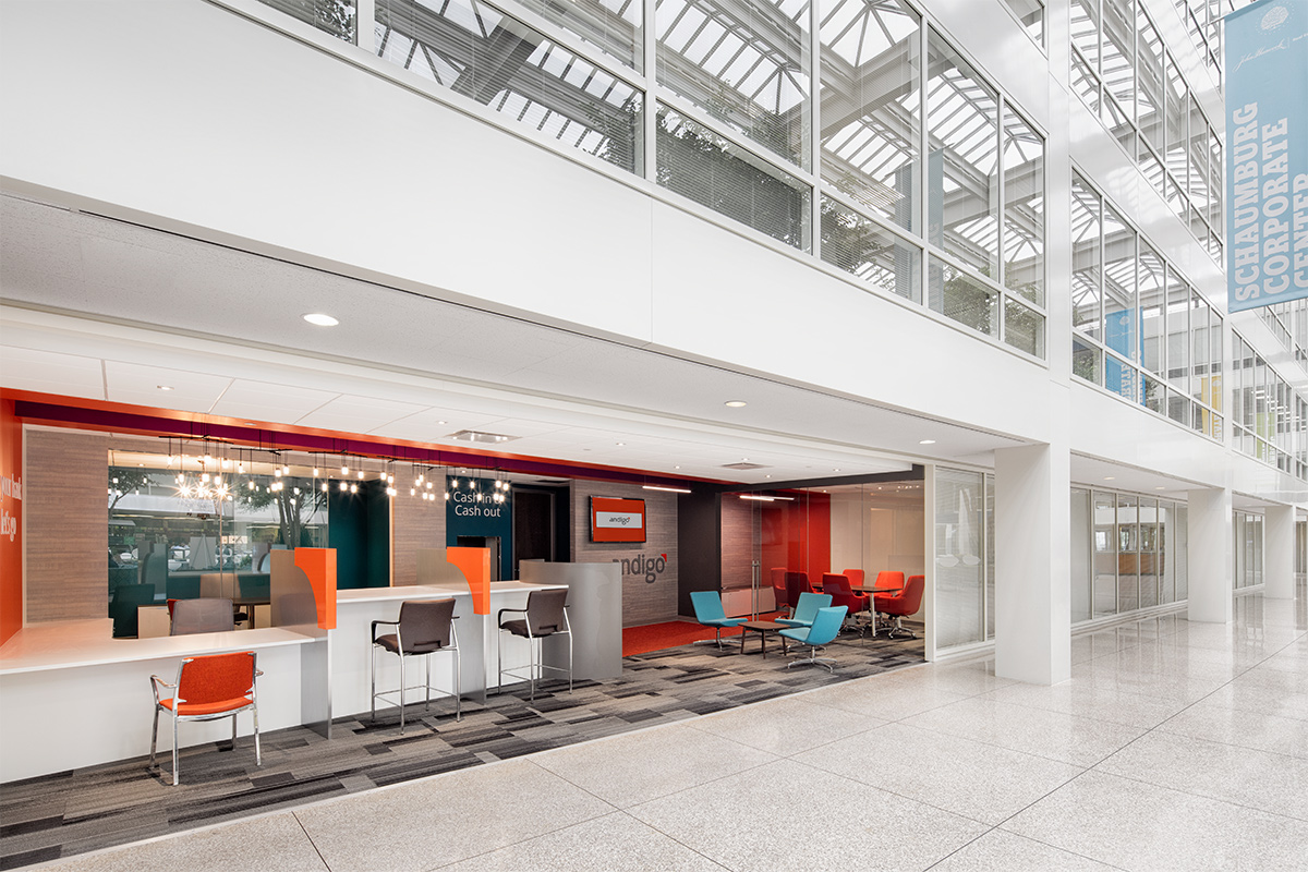 Working with 24,000 square feet in the Schaumburg Corporate Center near Chicago O’Hare International Airport, the new space allows all employees to be located on the same floor. Partnering closely with the Andigo Credit Union board of directors, Shive-Hattery led the corporate headquarters buildout and created new work-environment standards to reflect the organization’s new brand and identity.Instead of an interior that reflected the look and feel of a bank, the newly named Andigo Credit Union wanted a forward-thinking, high-tech space that wasn’t often seen in the financial industry. Orange and gray were chosen as the primary colors, with complementary colors used throughout the space as well.