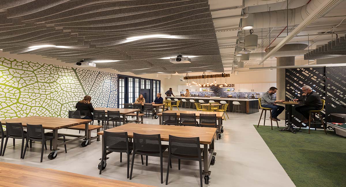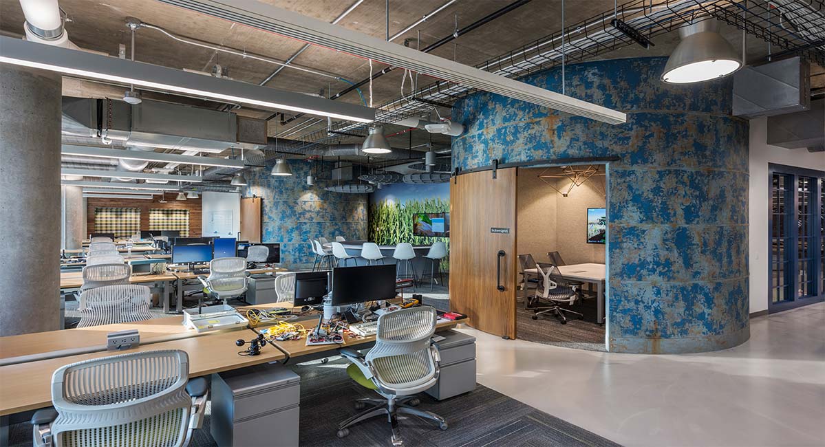 In the company’s breakroom, a divider wall features graphics that illustrate healthy cornstalk roots. Another prominent wall displays the proper cellular structure of a corn leaf, translated into abstract art to offer a nod to agriculture in a sleek, modern way.