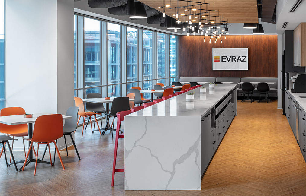Breakout and huddle spaces provide employees with ample space to work in partnership. A lunch room featuring custom-made snack drawers, a 25 foot island with seating and graphic wallcovering depicting the company’s strongly held values helps further Evraz’s culture of enrichment through collaboration.