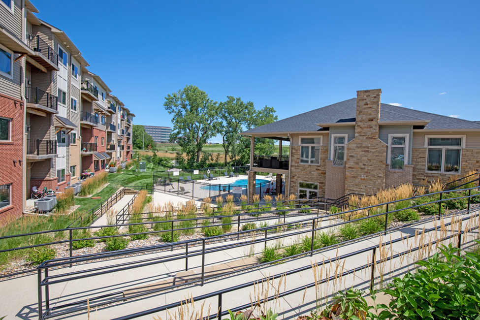 The apartment building designs are inspired interpretations of prairie-style architecture with hip roofs and a mixture of brick, stone, and multi-colored siding as exterior finishes. A winding road leading to a bridge brings residents into the multi-family community on the edge of West Des Moines. The tucked-away feel of the apartment complex makes it an excellent choice for anyone who is searching for a quiet home in a relaxed setting. Upon entering the neighborhood, residents are directed towards a walkout clubhouse and swimming pool, surrounded by nine strategically situated apartment buildings that provide positive view corridors throughout for residents and guests. Positive view corridors come from the arrangement of buildings and produce welcoming environments and give a sense of place.