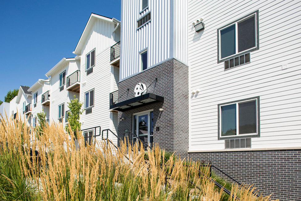 The unit types include mostly studio apartments, but also one and two-bedroom units. The small site was located on a significant slope which led to several walk-up units as well. A consistent aesthetic with The Towns exterior via scale and shape was an important design consideration. White siding and corrugated metal adorn the majority of the exterior while masonry around the base adds a visual anchor to the structure and highlights the building's entry points. The Towns consist of individual townhomes each with its own gable roof, so Shive-Hattery resolved to break up the side of the apartment building visually so that it appeared to be separate towers with separate gable roofs.