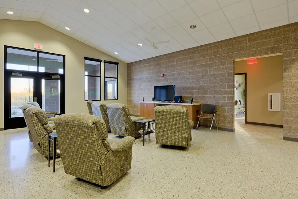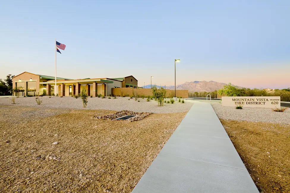 This is the first station completed for the new Mountain Vista Fire District. Station No. 620 includes 11 bunk rooms, a fitness room, dayroom, kitchen, decontamination area, turnout gear room, SCBA/hose storage, and two full apparatus bays plus a half bay for an ambulance. The design includes ground concrete floors, masonry construction, a solar hot water system, and solartube skylights. The station is designed and built to have a long life span and to accommodate a future apparatus bay.